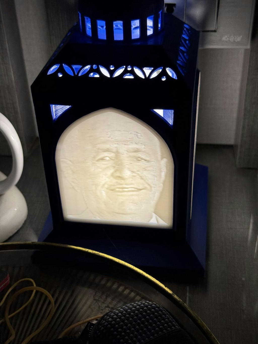 A modern lantern with a sleek geometric design with your name or image glowing from within.
